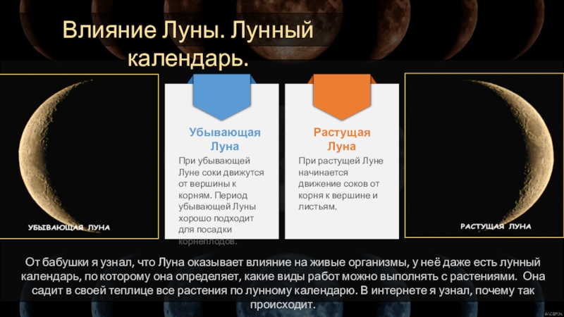 От бабушки я узнал, что Луна оказывает влияние на живые организмы, у неё даже есть лунный календарь, по которому она определяет, какие виды работ можно выполнять с растениями. Она садит в своей теплице все растения по лунному календарю. В интернете я узнал, почему так происходит.