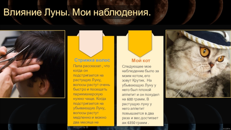 Следующее мое наблюдение было за моим котом, его зовут Крутик. На убывающую Луну у него был плохой аппетит и он похудел на 600 грамм. В растущую луну у него аппетит повышается в два раза и вес достигает аж 6350 грамм .