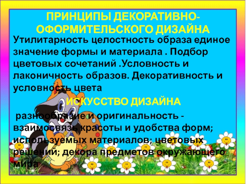 Слайд 5ПРИНЦИПЫ ДЕКОРАТИВНО- ОФОРМИТЕЛЬСКОГО ДИЗАЙНА