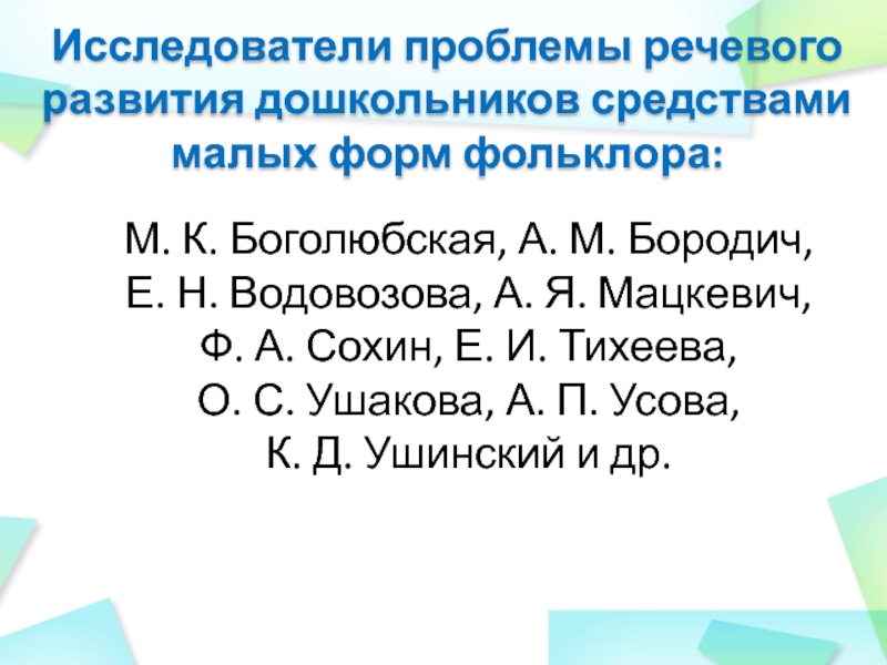 Исследователи проблемы речевого развития дошкольников средствами малых форм фольклора: