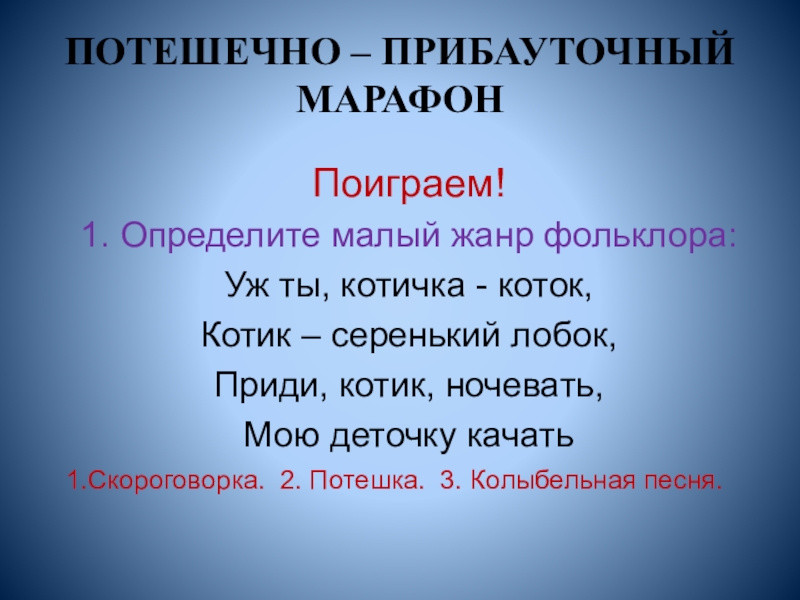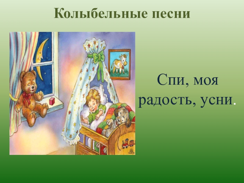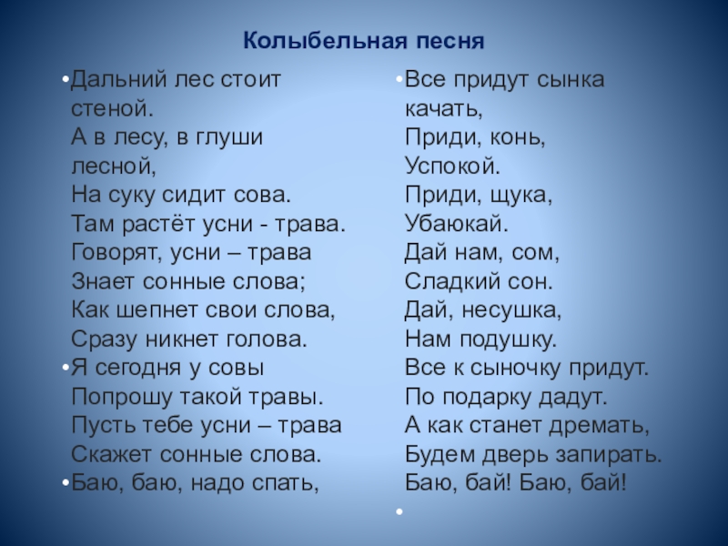 Все придут сынка качать, Приди, конь, Успокой. Приди, щука, Убаюкай. Дай нам, сом, Сладкий сон. Дай, несушка, Нам подушку. Все к сыночку придут. По подарку дадут. А как станет дремать, Будем дверь запирать. Баю, бай! Баю, бай!