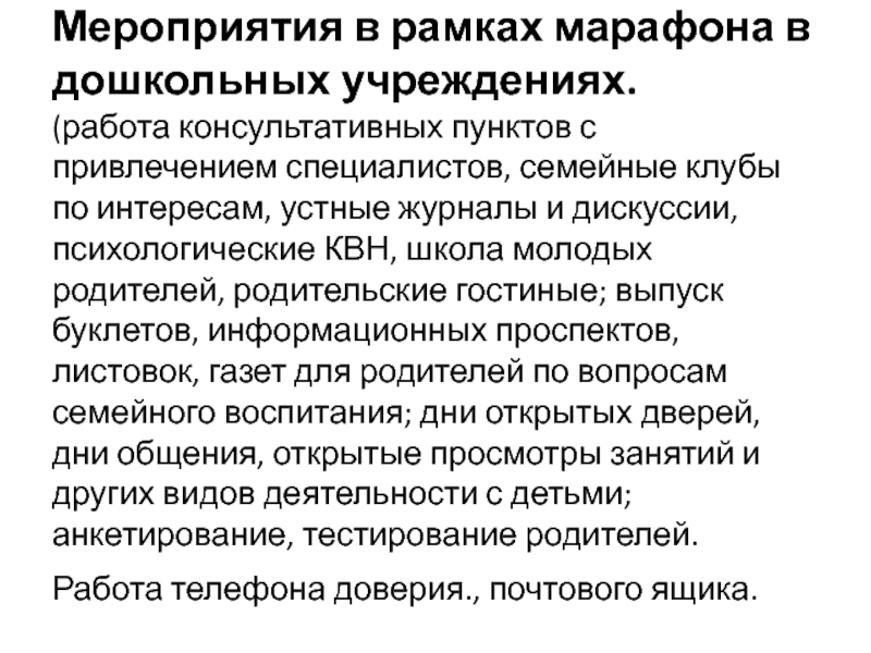 привлечением специалистов, семейные клубы по интересам, устные журналы и дискуссии, психологические КВН, школа молодых родителей, родительские гостиные; выпуск буклетов, информационных проспектов, листовок, газет для родителей по вопросам семейного воспитания; дни открытых дверей, дни общения, открытые просмотры занятий и других видов деятельности с детьми; анкетирование, тестирование родителей. Работа телефона доверия., почтового ящика.