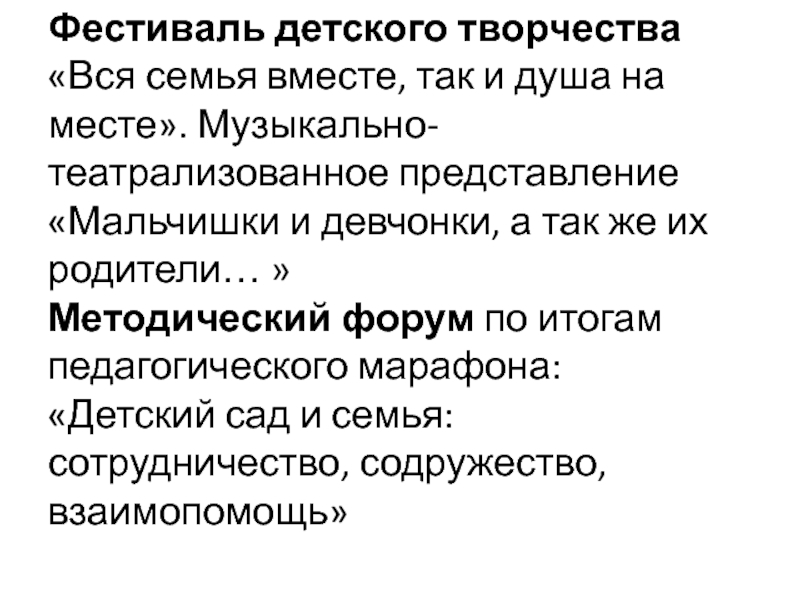 Слайд 9Фестиваль детского творчества «Вся семья вместе, так и душа на месте».