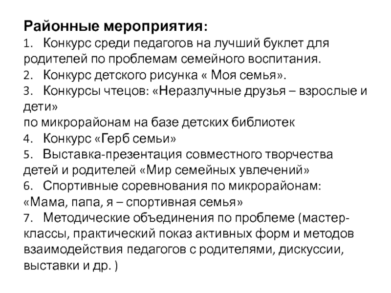 7. Методические объединения по проблеме (мастер-классы, практический показ активных форм и методов взаимодействия педагогов с родителями, дискуссии, выставки и др. )