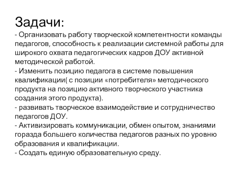 - Организовать работу творческой компетентности команды педагогов, способность к реализации системной