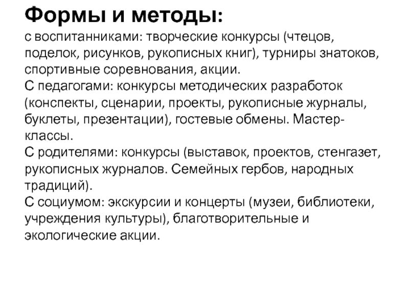 С педагогами: конкурсы методических разработок (конспекты, сценарии, проекты, рукописные журналы, буклеты, презентации), гостевые обмены. Мастер- классы.