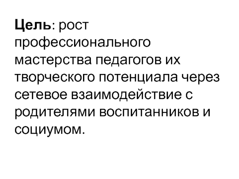 Слайд 2Цель: рост профессионального мастерства педагогов их творческого потенциала через сетевое взаимодействие