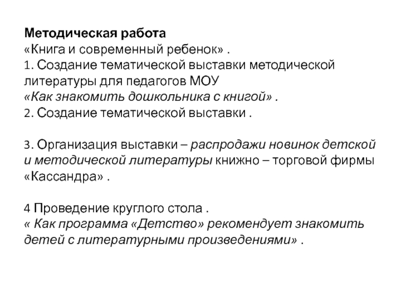 3. Организация выставки – распродажи новинок детской и методической литературы книжно – торговой фирмы «Кассандра» .