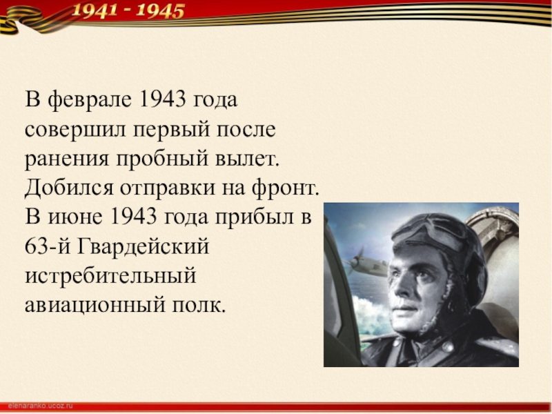 Слайд 8В феврале 1943 года совершил первый после ранения пробный вылет. Добился