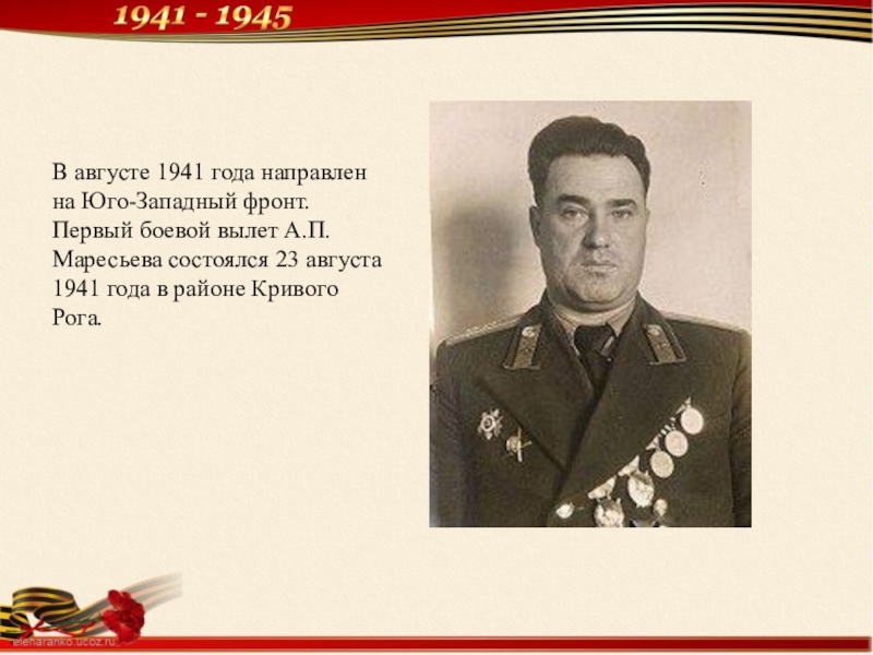 В августе 1941 года направлен на Юго-Западный фронт. Первый боевой вылет А.П. Маресьева состоялся 23 августа 1941