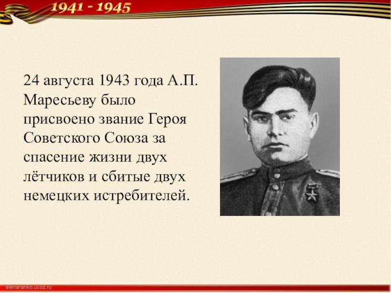 Слайд 924 августа 1943 года А.П. Маресьеву было присвоено звание Героя Советского