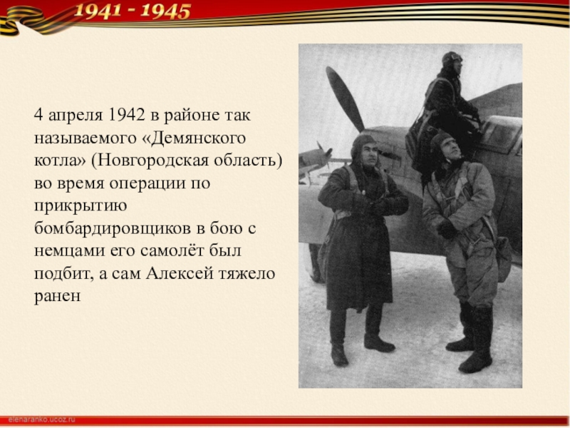 4 апреля 1942 в районе так называемого «Демянского котла» (Новгородская область) во время операции по прикрытию бомбардировщиков