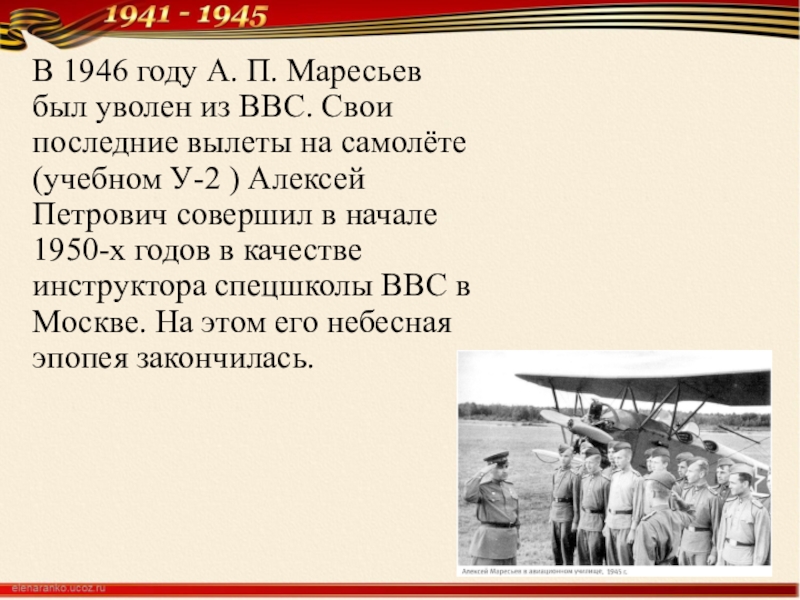 Слайд 11В 1946 году А. П. Маресьев был уволен из ВВС. Свои