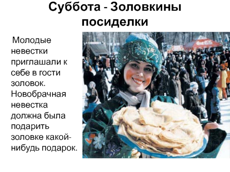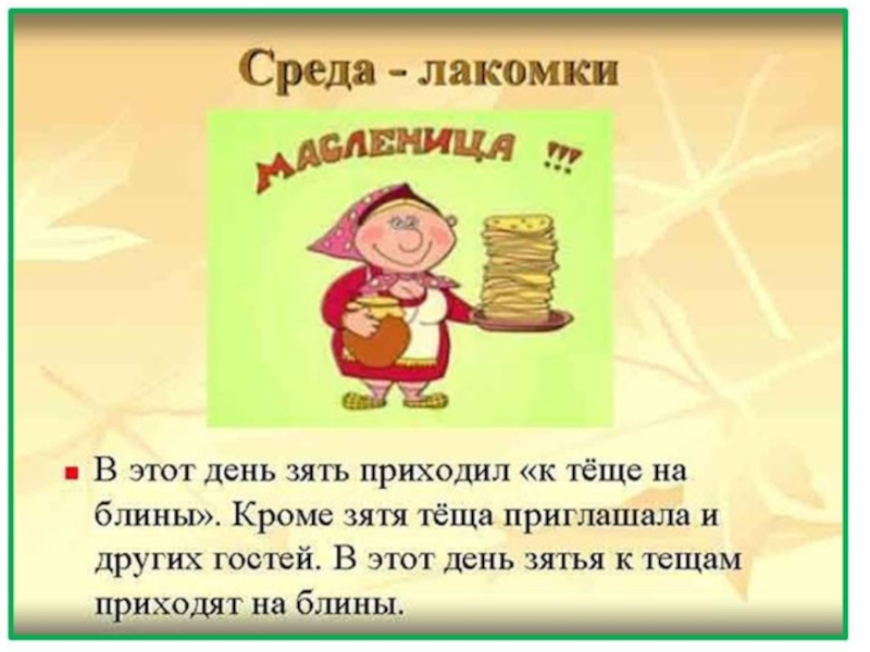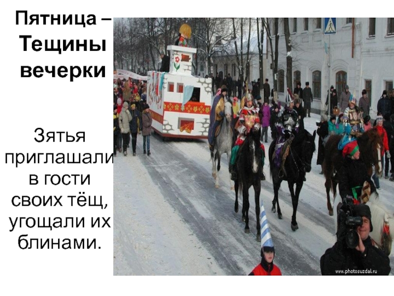 Пятница –  Тещины вечерки Зятья приглашали в гости своих тёщ, угощали их блинами.