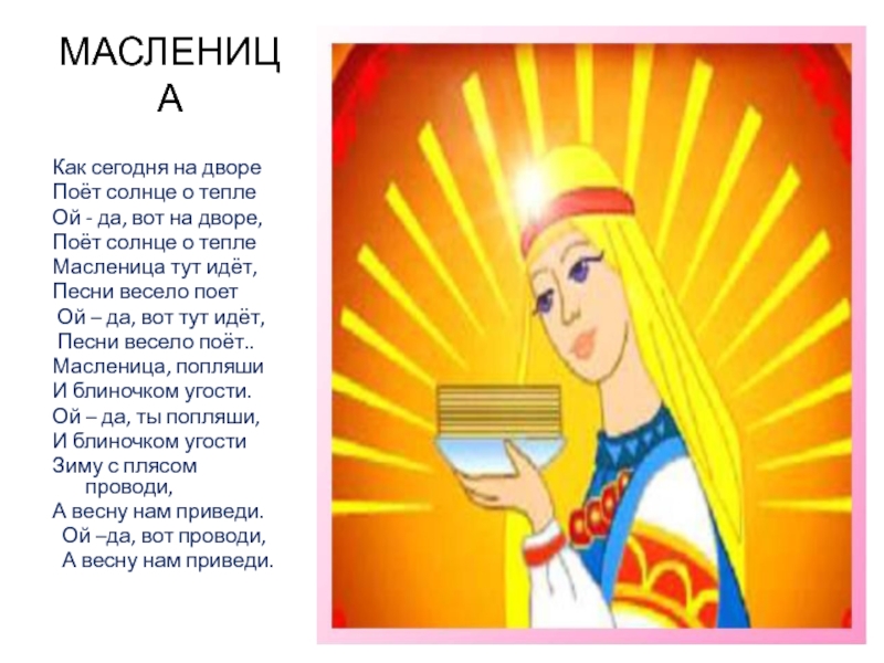МАСЛЕНИЦАКак сегодня на двореПоёт солнце о теплеОй - да, вот на дворе,Поёт солнце о теплеМасленица тут идёт,Песни