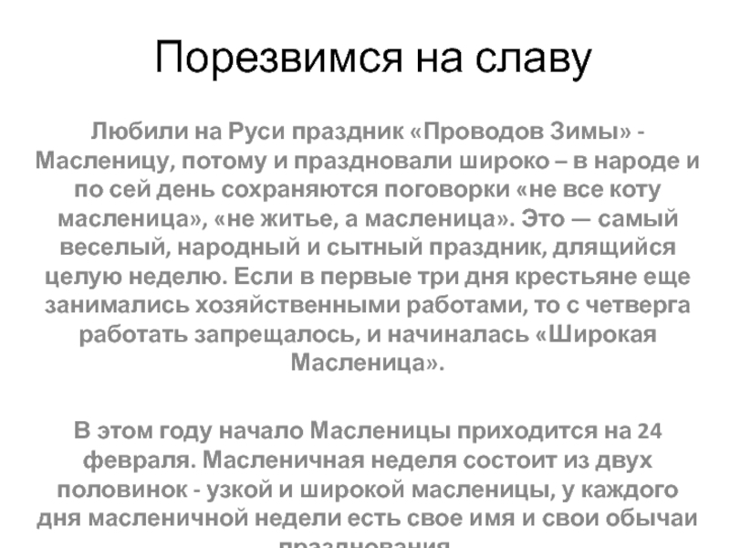 Порезвимся на славуЛюбили на Руси праздник «Проводов Зимы» - Масленицу, потому и праздновали широко – в