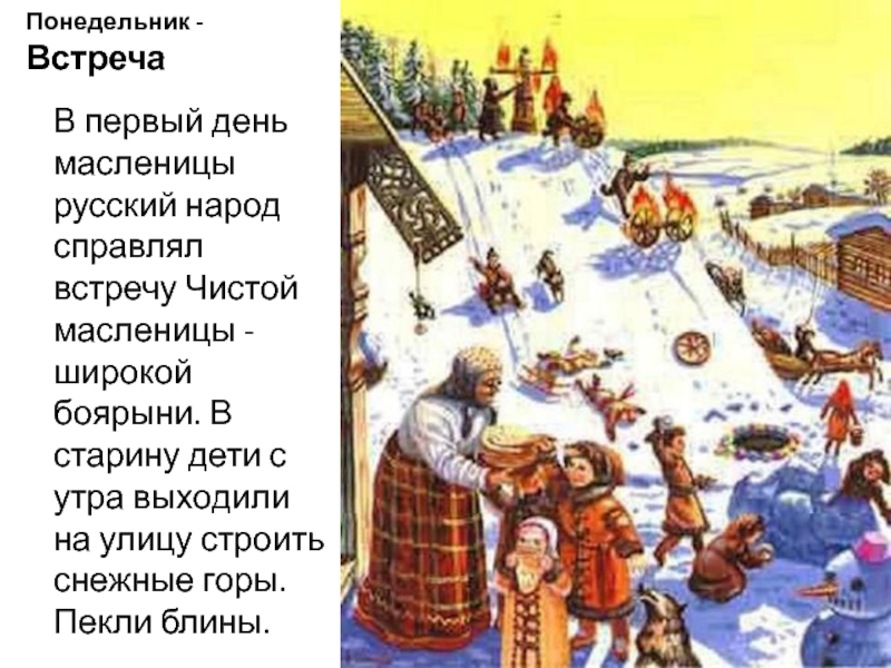 Понедельник - ВстречаВ первый день масленицы русский народ справлял встречу Чистой масленицы - широкой боярыни. В старину