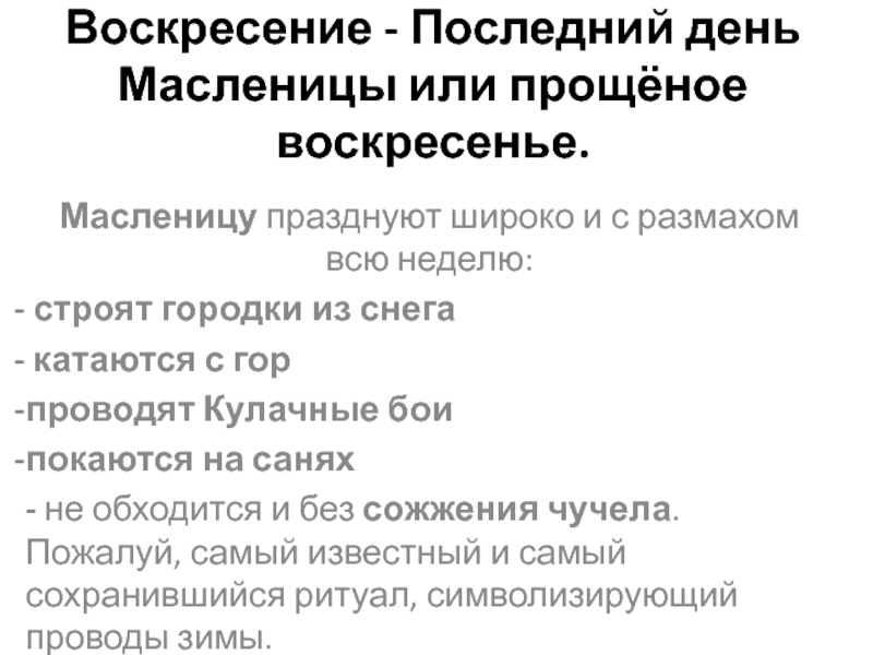 Слайд 16Воскресение - Последний день Масленицы или прощёное воскресенье.