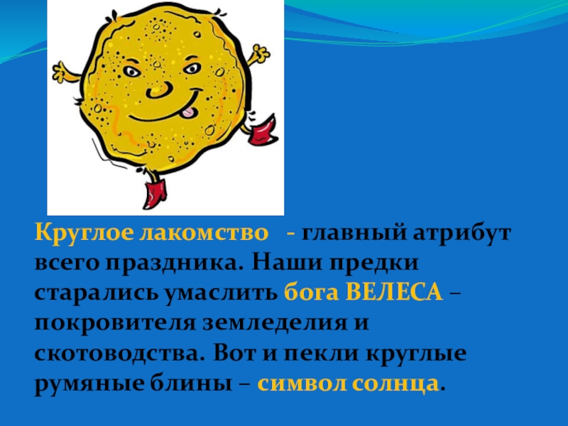 умаслить бога ВЕЛЕСА – покровителя земледелия и скотоводства. Вот и пекли круглые румяные блины – символ солнца.
