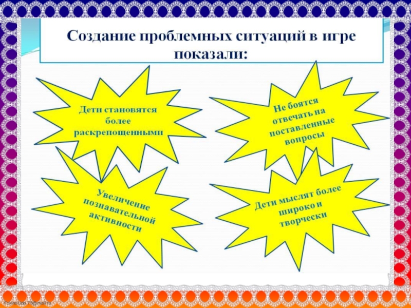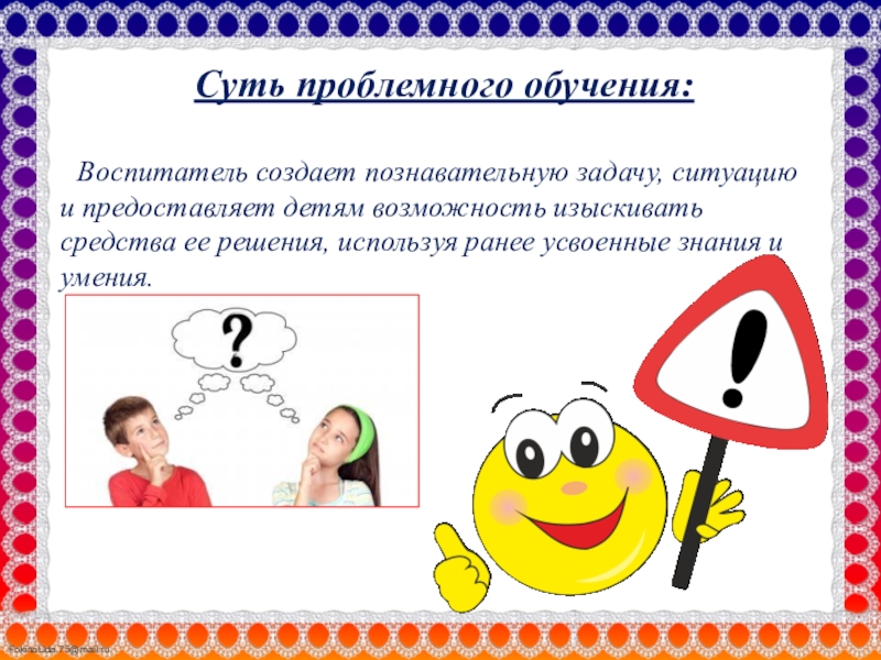 Суть проблемного обучения:Воспитатель создает познавательную задачу, ситуацию и предоставляет детям возможность изыскивать средства ее решения, используя ранее