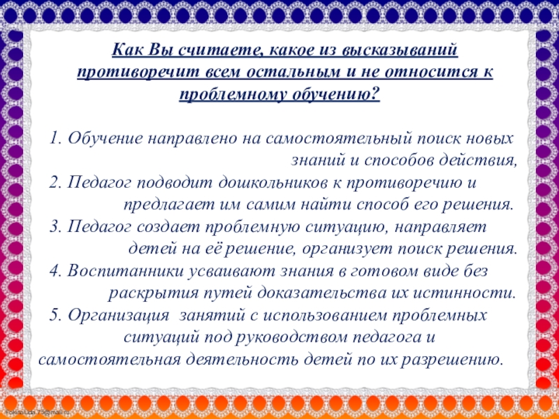 Как Вы считаете, какое из высказываний противоречит всем остальным и не относится к проблемному обучению?1. Обучение направлено