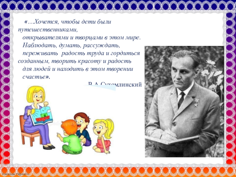 «…Хочется, чтобы дети были путешественниками, открывателями и творцами в этом мире. Наблюдать, думать, рассуждать, переживать радость труда и гордиться созданным, творить красоту и радость для людей и находить в этом творении счастье».