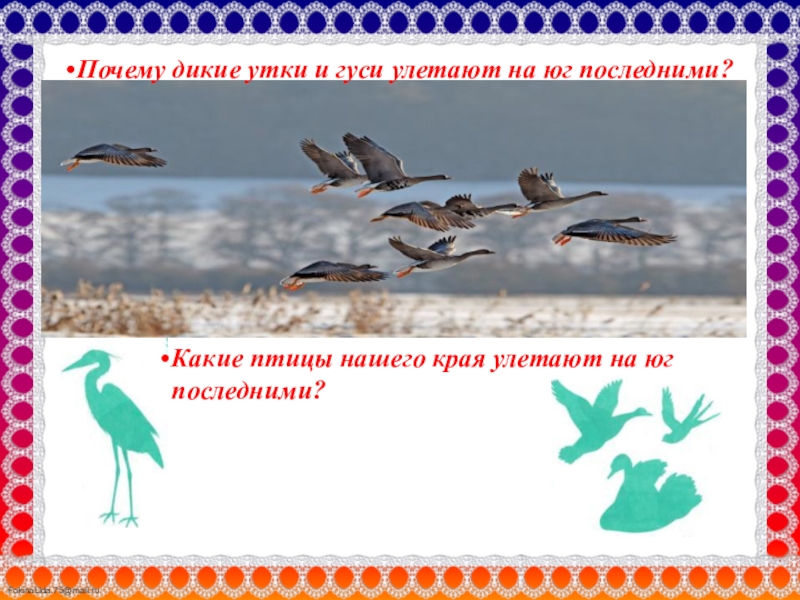 Слайд 10Почему дикие утки и гуси улетают на юг последними?