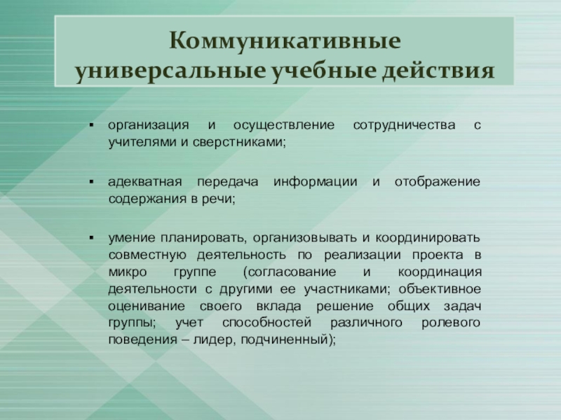 умение планировать, организовывать и координировать совместную деятельность по реализации проекта в микро группе (согласование и координация деятельности с другими ее участниками; объективное оценивание своего вклада решение общих задач группы; учет способностей различного ролевого поведения – лидер, подчиненный);