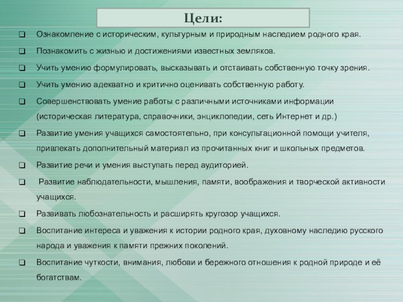 Воспитание интереса и уважения к истории родного края, духовному наследию русского народа и уважения к памяти прежних поколений.