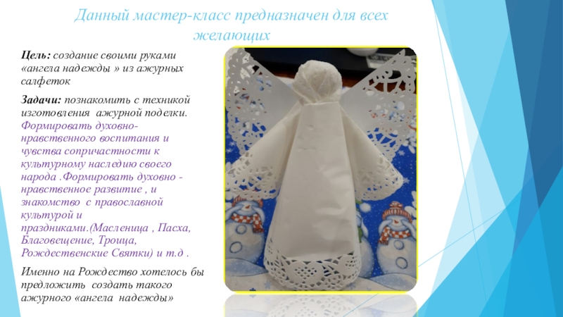 Данный мастер-класс предназначен для всех желающих Цель: создание своими руками «ангела надежды » из ажурных салфетокЗадачи: познакомить