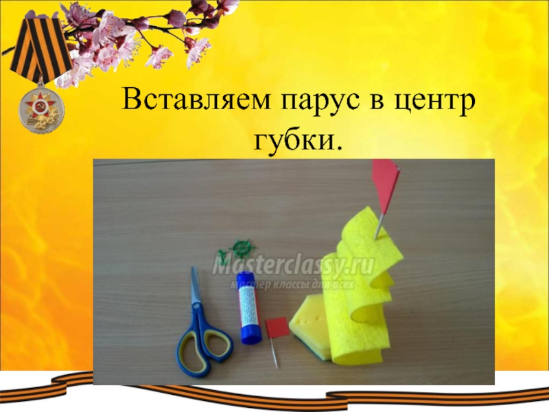 Слайд 4Приготовив материалы для работы, обрезаем губку под углом с двух сторон.