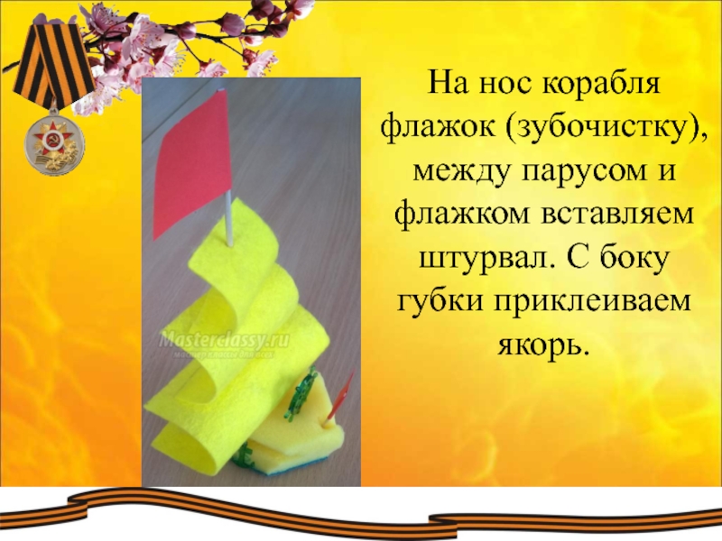 Слайд 7На нос корабля флажок (зубочистку), между парусом и флажком вставляем штурвал.