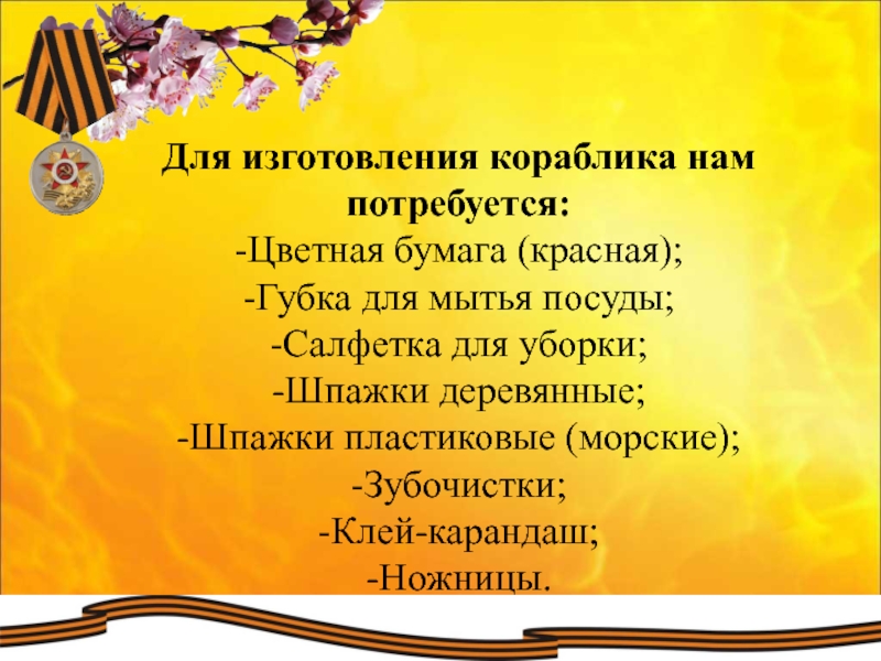 Слайд 2Для изготовления кораблика нам потребуется: -Цветная бумага (красная); -Губка для мытья посуды; -Салфетка для