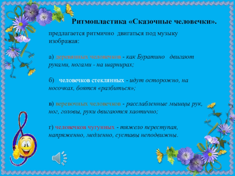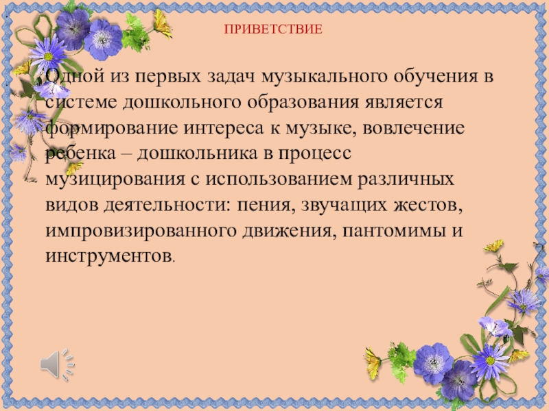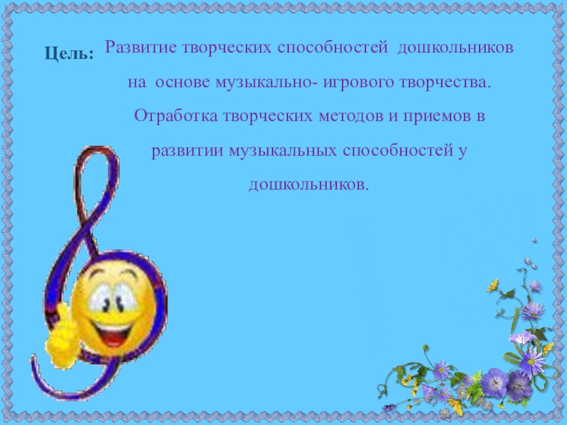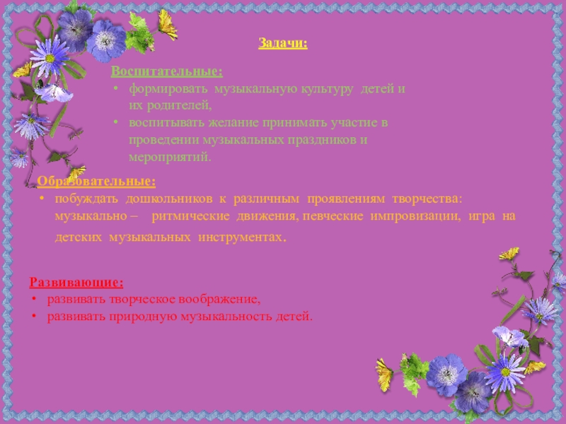 побуждать дошкольников к различным проявлениям творчества: музыкально – ритмические движения, певческие импровизации, игра на детских музыкальных инструментах.