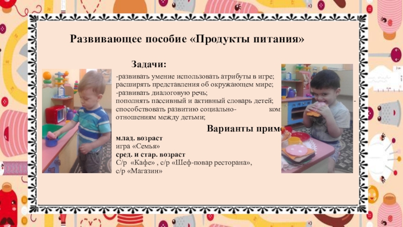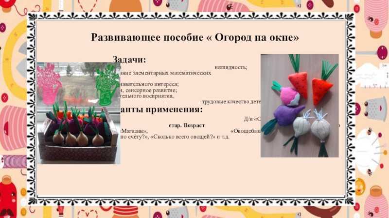 - развитие зрительного восприятия, самостоятельности. - -трудовые качества детей Варианты применения: млад. возраст Д/и «Овощи», д/и «Кого овоща не стало?» стар. Возраст С/р игра «Фермерское хозяйство», «Магазин», «Овощебаза» Д/и «Который по счёту?», «Сколько всего овощей?» и т.д.