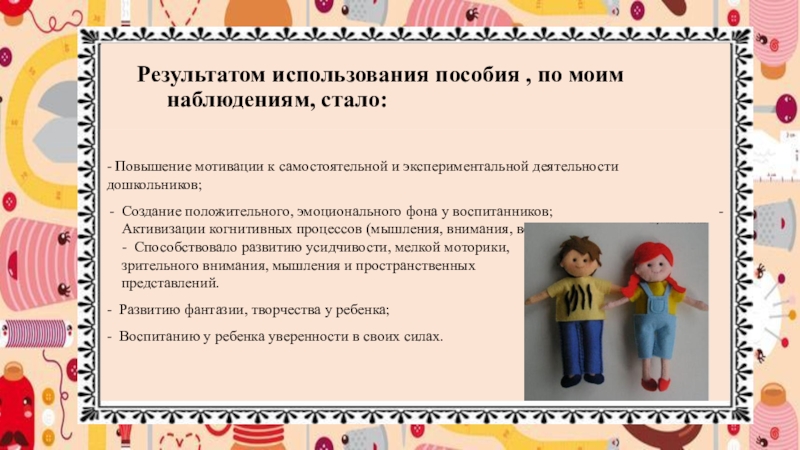 - Способствовало развитию усидчивости, мелкой моторики, зрительного внимания, мышления и пространственных представлений.