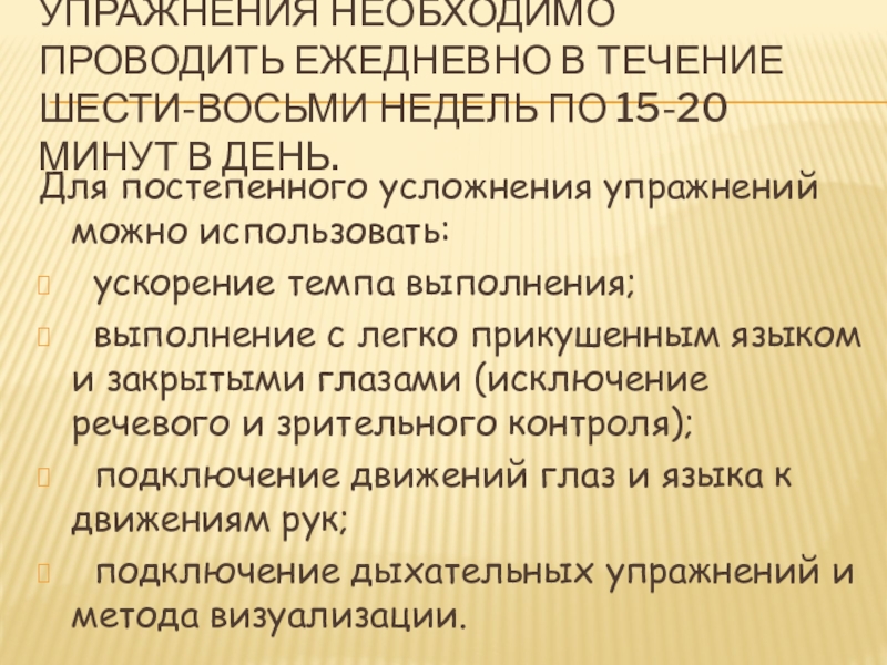 выполнение с легко прикушенным языком и закрытыми глазами (исключение речевого и зрительного контроля);