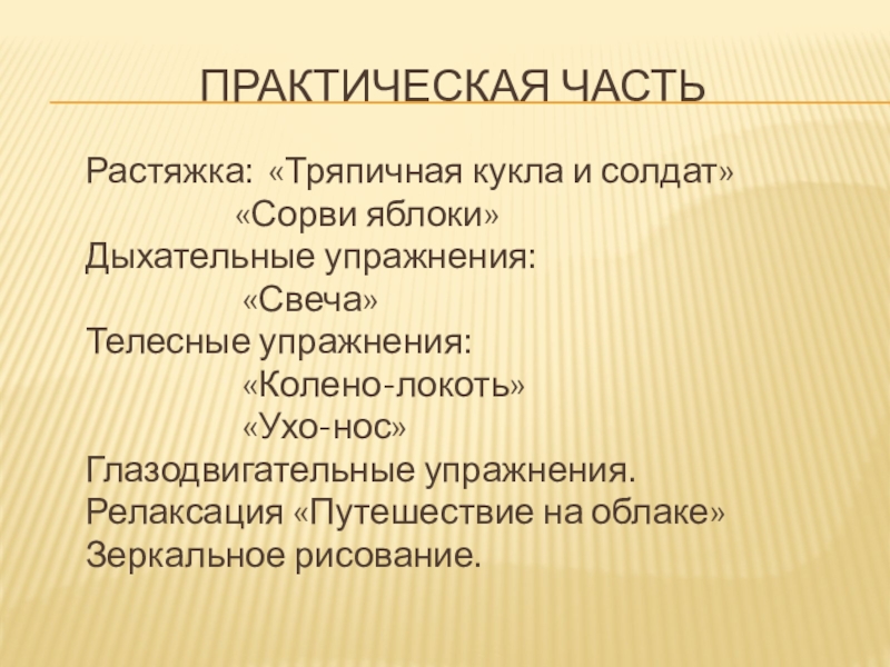 подключение дыхательных упражнений и метода визуализации.