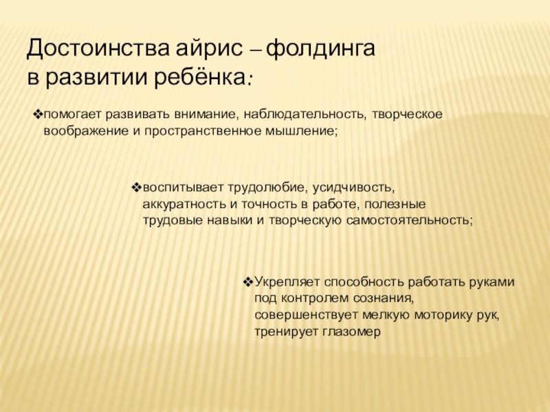 Укрепляет способность работать руками под контролем сознания, совершенствует мелкую моторику рук, тренирует глазомер