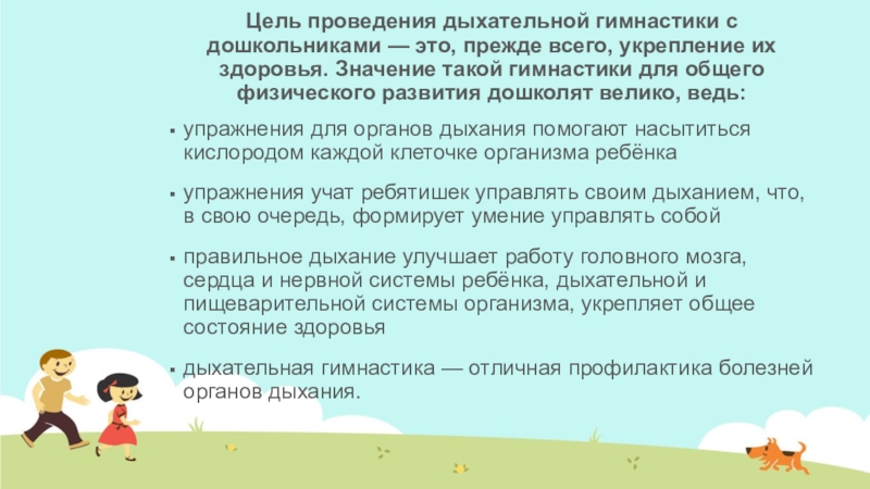 правильное дыхание улучшает работу головного мозга, сердца и нервной системы ребёнка, дыхательной и пищеварительной системы организма, укрепляет общее состояние здоровья
