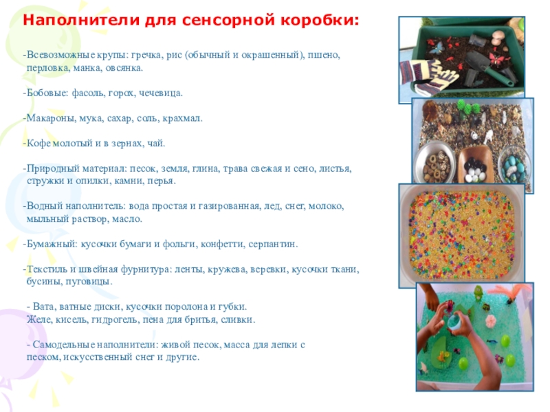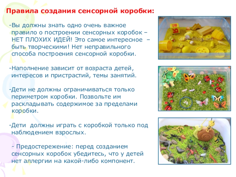 - Предостережение: перед созданием сенсорных коробок убедитесь, что у детей нет аллергии на какой-либо компонент.