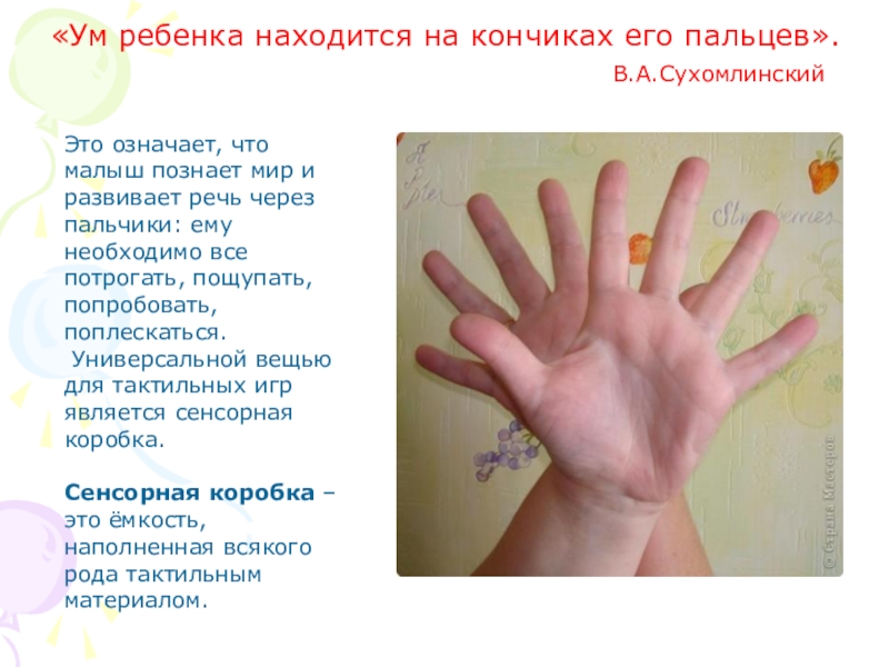 Слайд 2Это означает, что малыш познает мир и развивает речь через пальчики: