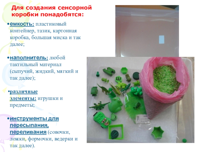 Слайд 9Изготавливаем своими руками сенсорную коробку на тему «Зелёный цвет»