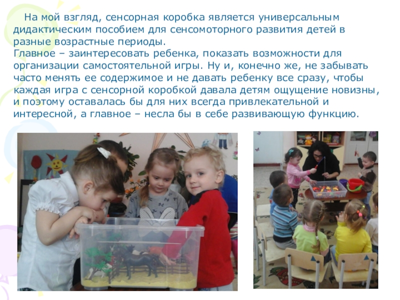 Слайд 10 На мой взгляд, сенсорная коробка является универсальным дидактическим пособием