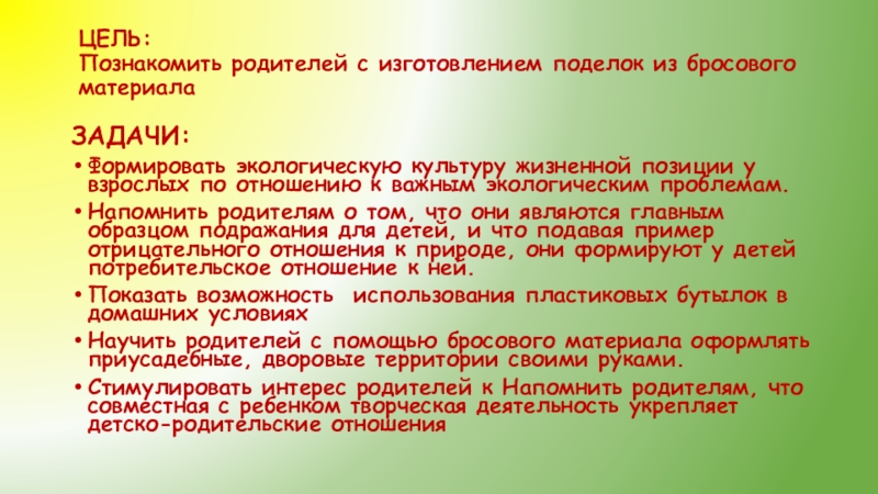 ЦЕЛЬ: Познакомить родителей с изготовлением поделок из бросового материала ЗАДАЧИ:Формировать экологическую культуру жизненной позиции у взрослых по