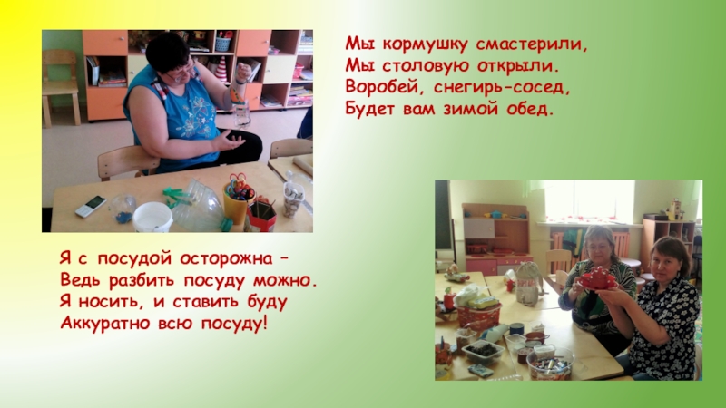 Мы кормушку смастерили, Мы столовую открыли. Воробей, снегирь-сосед, Будет вам зимой обед.Я с посудой осторожна – Ведь разбить посуду