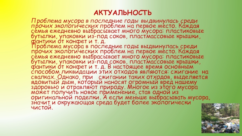 АКТУАЛЬНОСТЬПроблема мусора в последние годы выдвинулась среди прочих экологических проблем на первое место. Каждая семья ежедневно выбрасывает