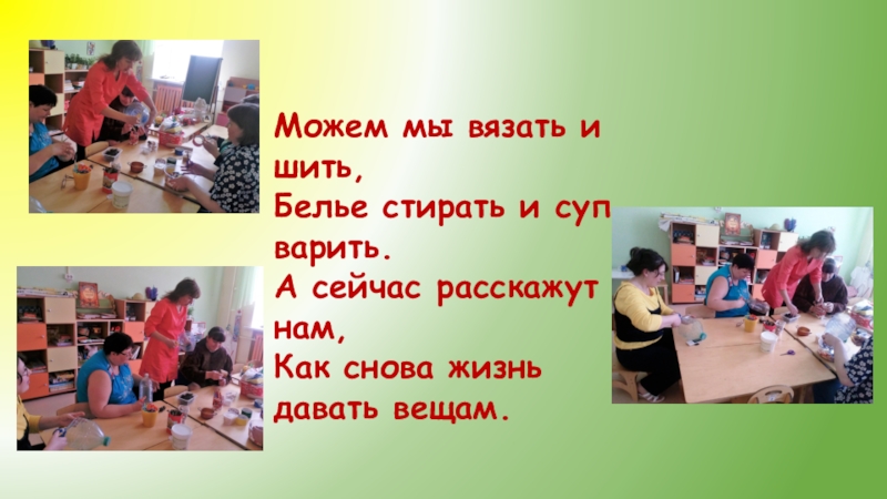 Можем мы вязать и шить,Белье стирать и суп варить.А сейчас расскажут нам,Как снова жизнь давать вещам.