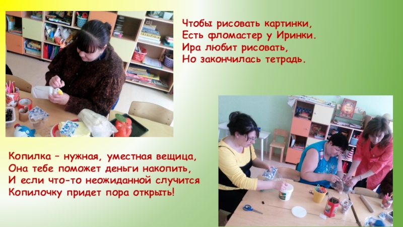 Чтобы рисовать картинки, Есть фломастер у Иринки. Ира любит рисовать, Но закончилась тетрадь.Копилка – нужная, уместная вещица,