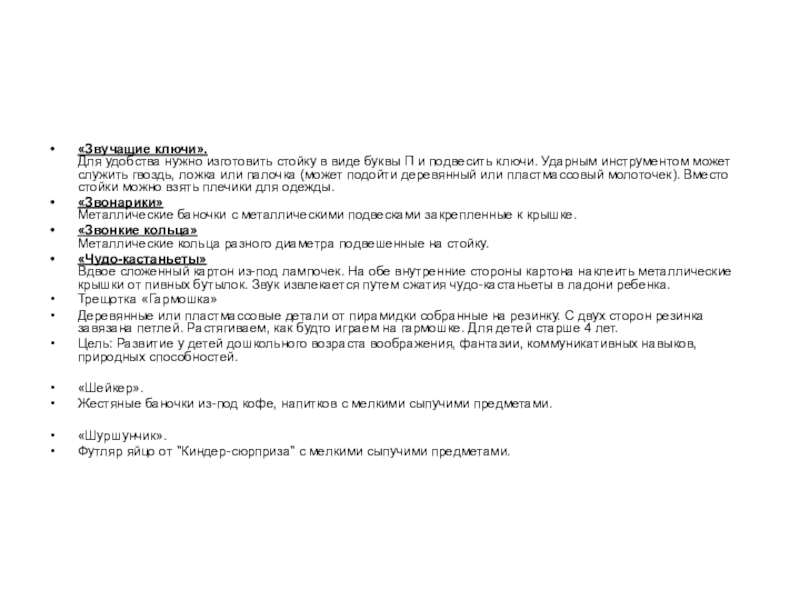 «Звучащие ключи». Для удобства нужно изготовить стойку в виде буквы П и подвесить ключи. Ударным инструментом может